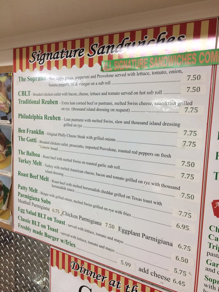 Salami, pepperoni, ham cappy, provolone, lettuce, tomato, onion, banana peppers and house dressing on a sub.